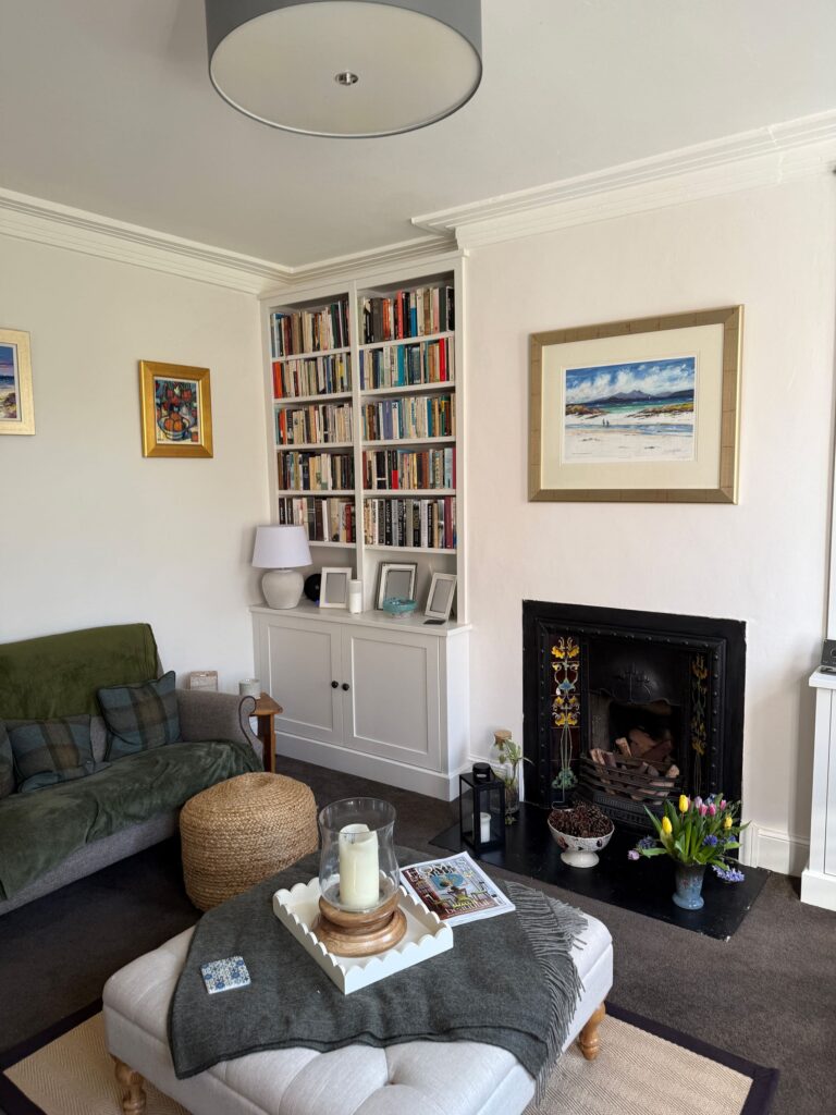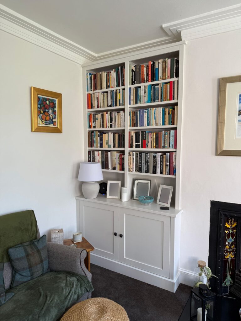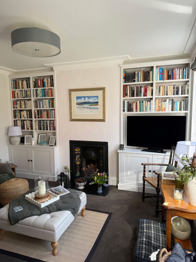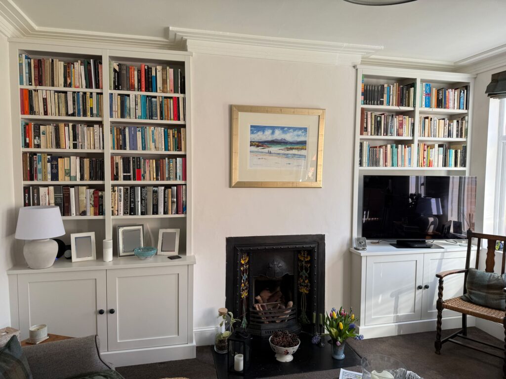 Two bespoke alcove units with bookshelves, space for TV, and storage cupboards. Fitted to surround fireplace, and painted in Farrow and Ball Strong White.