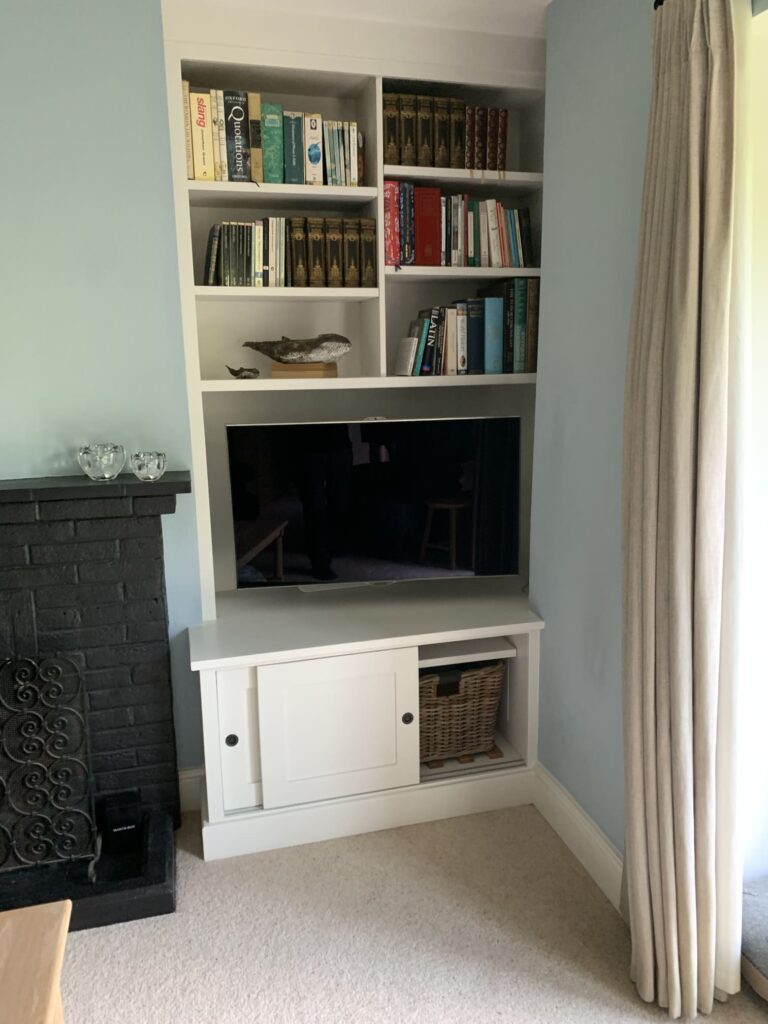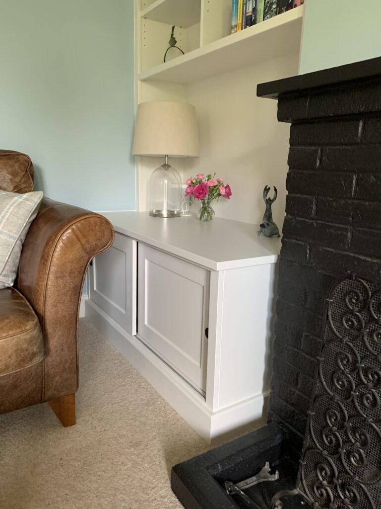 A pair of bespoke alcove units surrounding a central fireplace, complete with sliding doors and space for a slide-out log basket. Finished in hand painted Farrow and Ball Strong White.