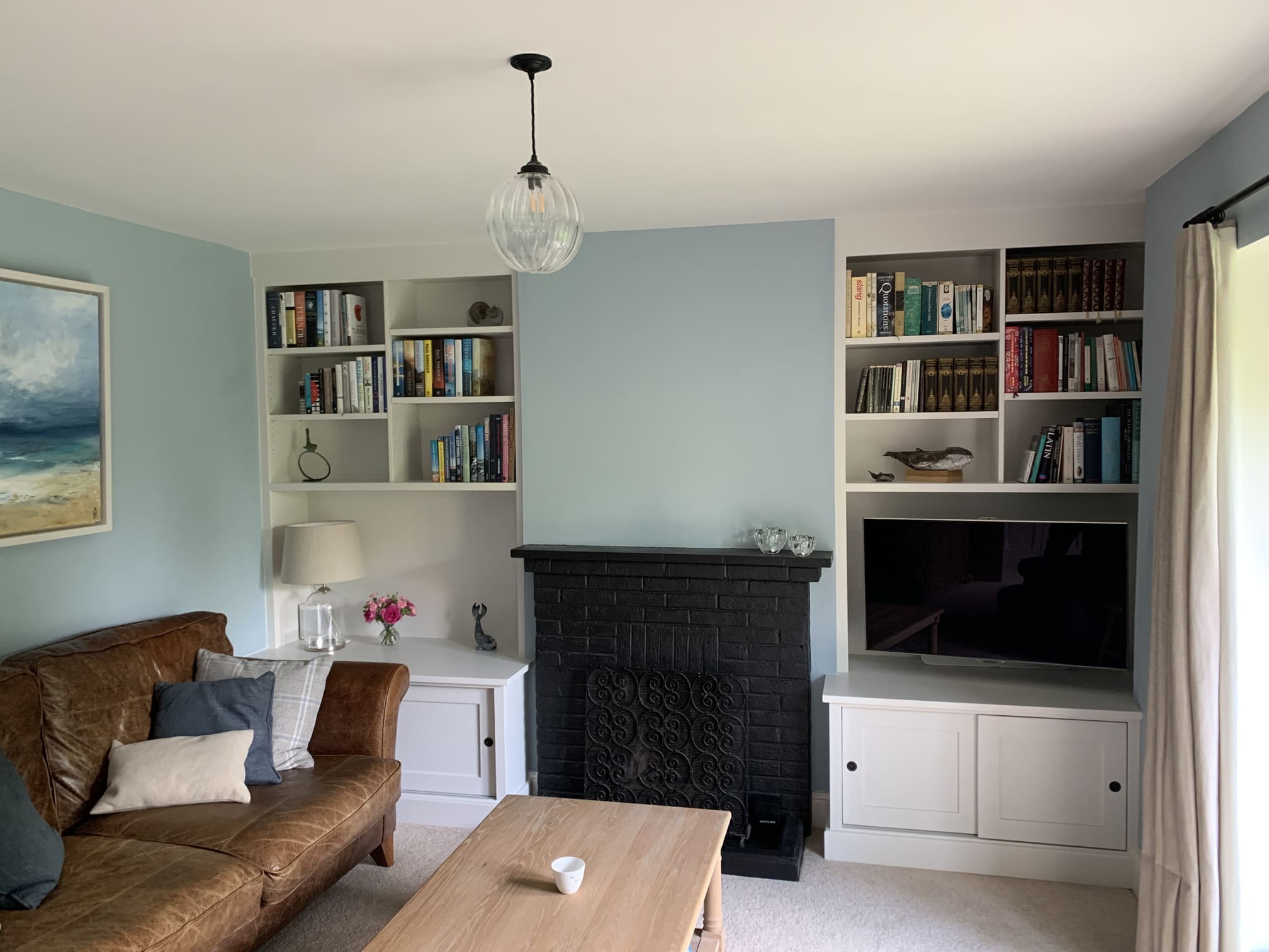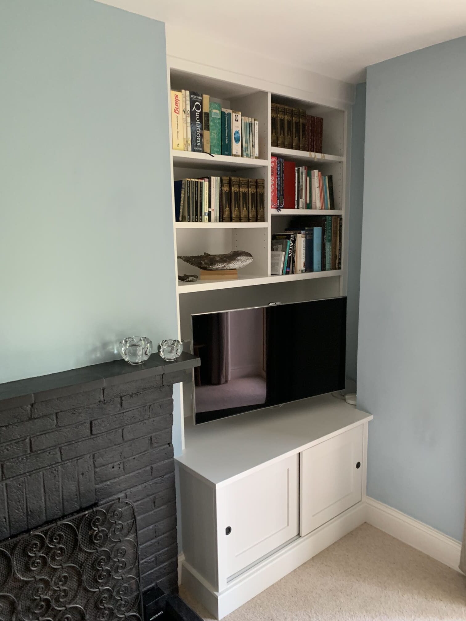 A pair of bespoke alcove units surrounding a central fireplace, complete with sliding doors and space for a slide-out log basket. Finished in hand painted Farrow and Ball Strong White.