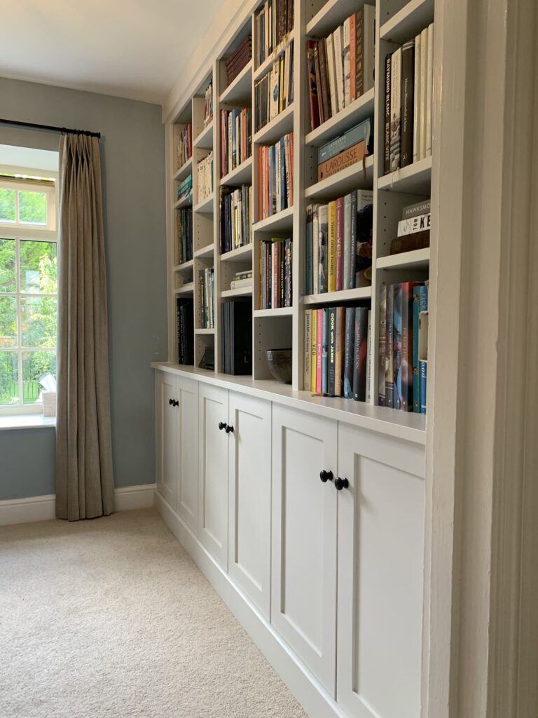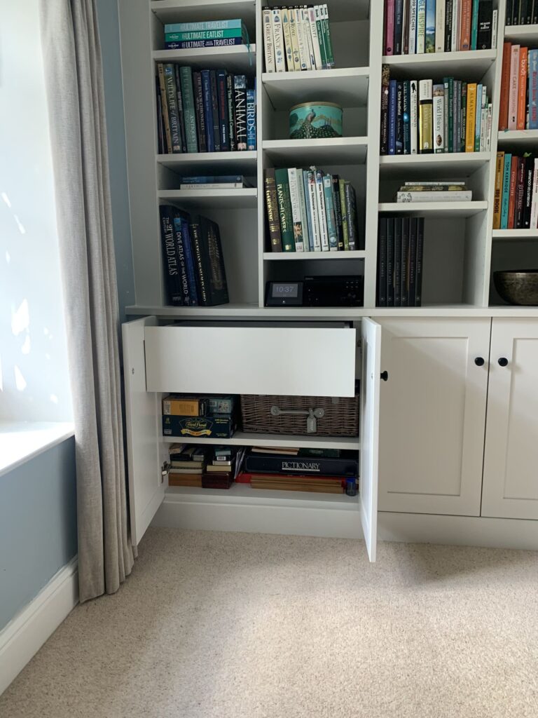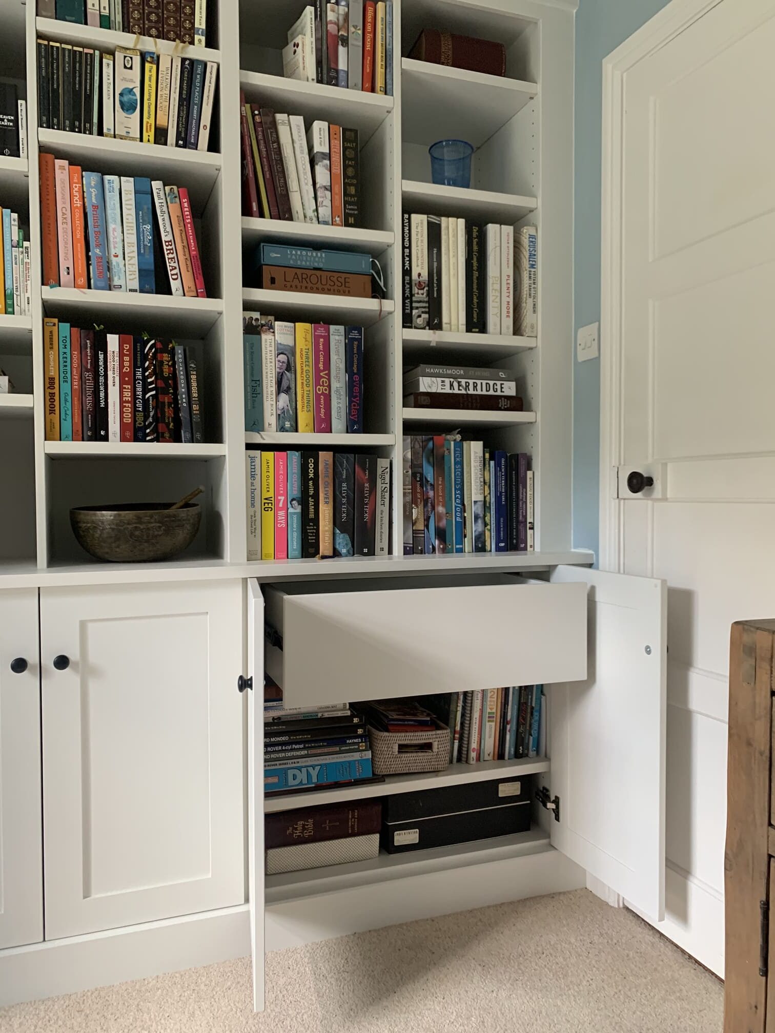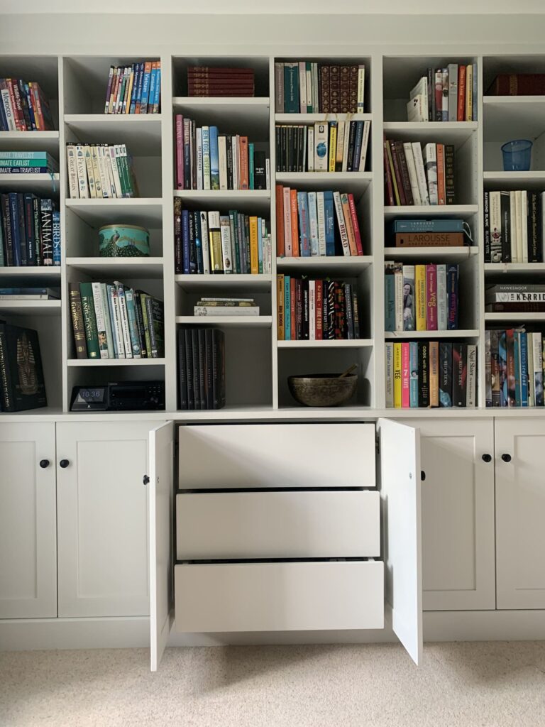 A bespoke full-wall bookcase with internal drawers and shelving. Height adjustable shelves to accommodate the customer's various sized books and ornaments.