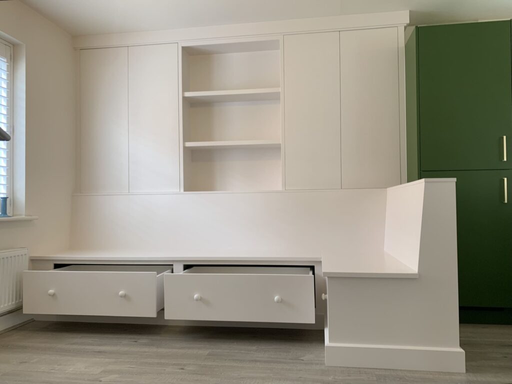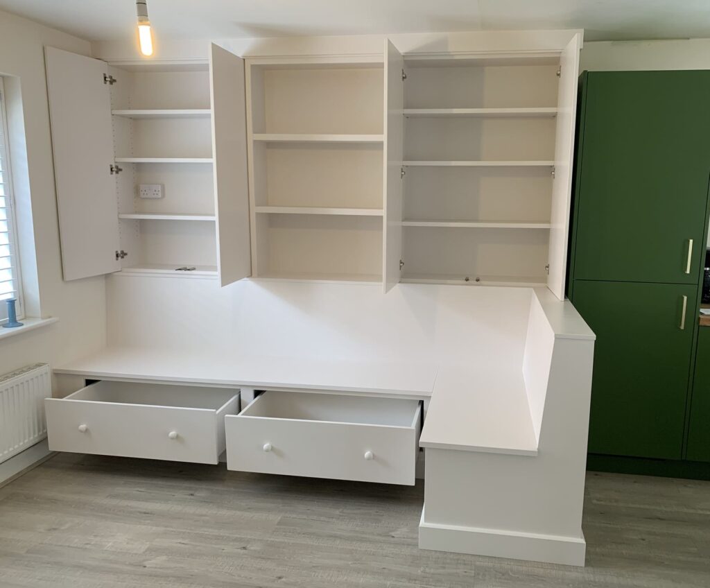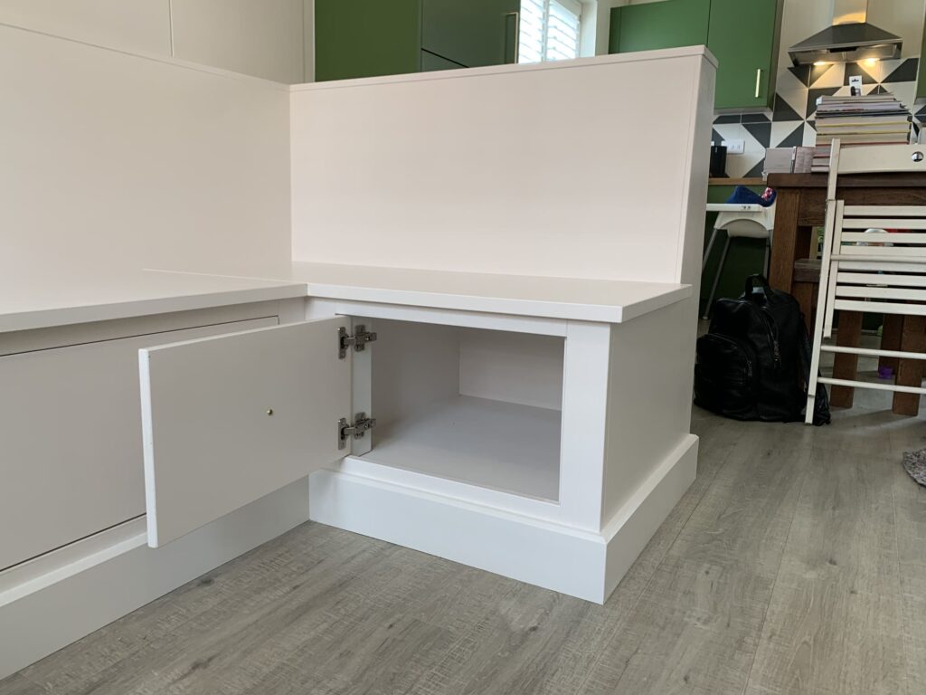 Bespoke kitchen seating with storage above, drawers, and integrated storage below the seats.