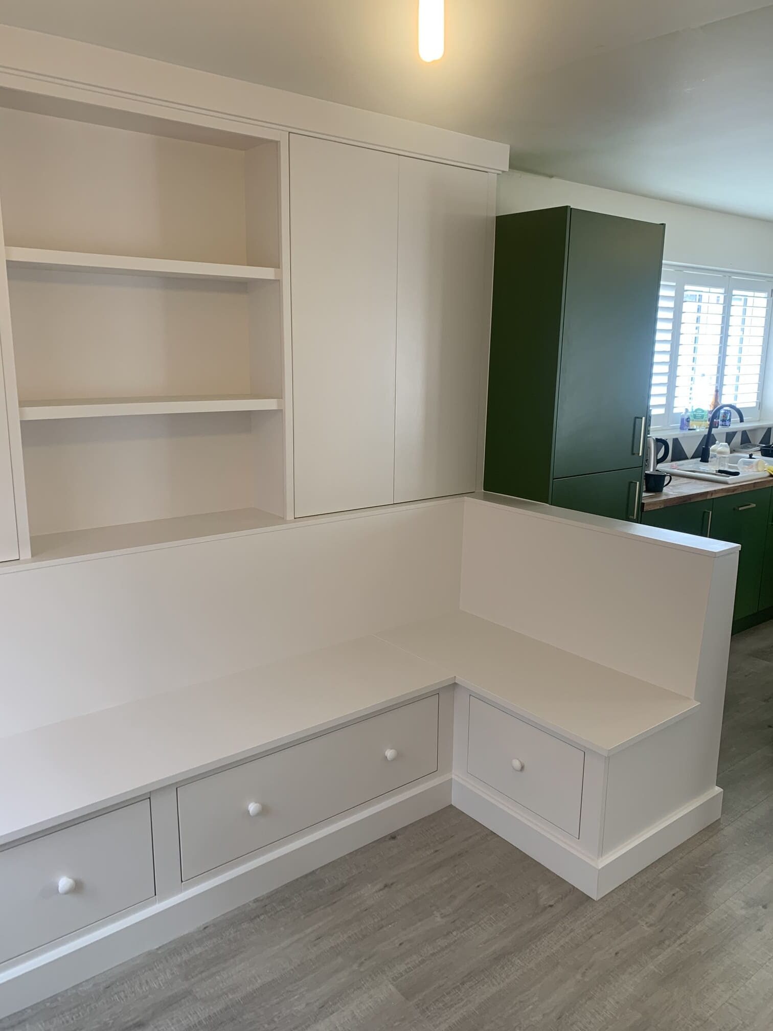 Bespoke kitchen seating with storage above, drawers, and integrated storage below the seats.