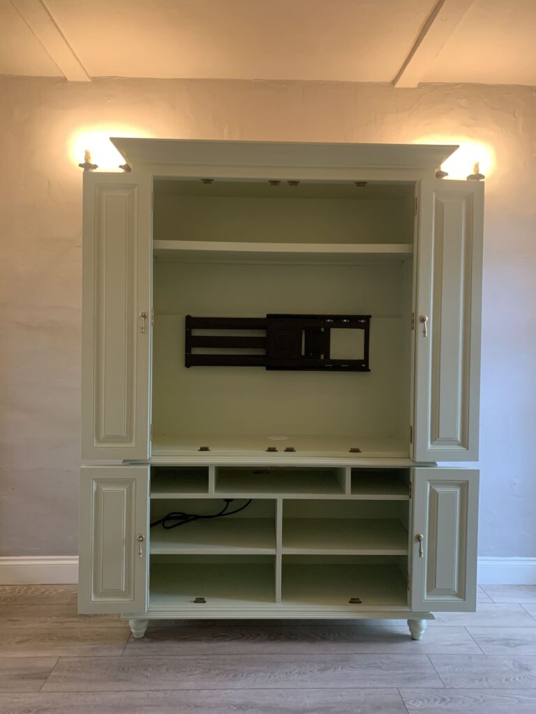 Bespoke TV unit with bifold doors and internal shelving. Also features pull-out TV bracket and raised panel-style doors.