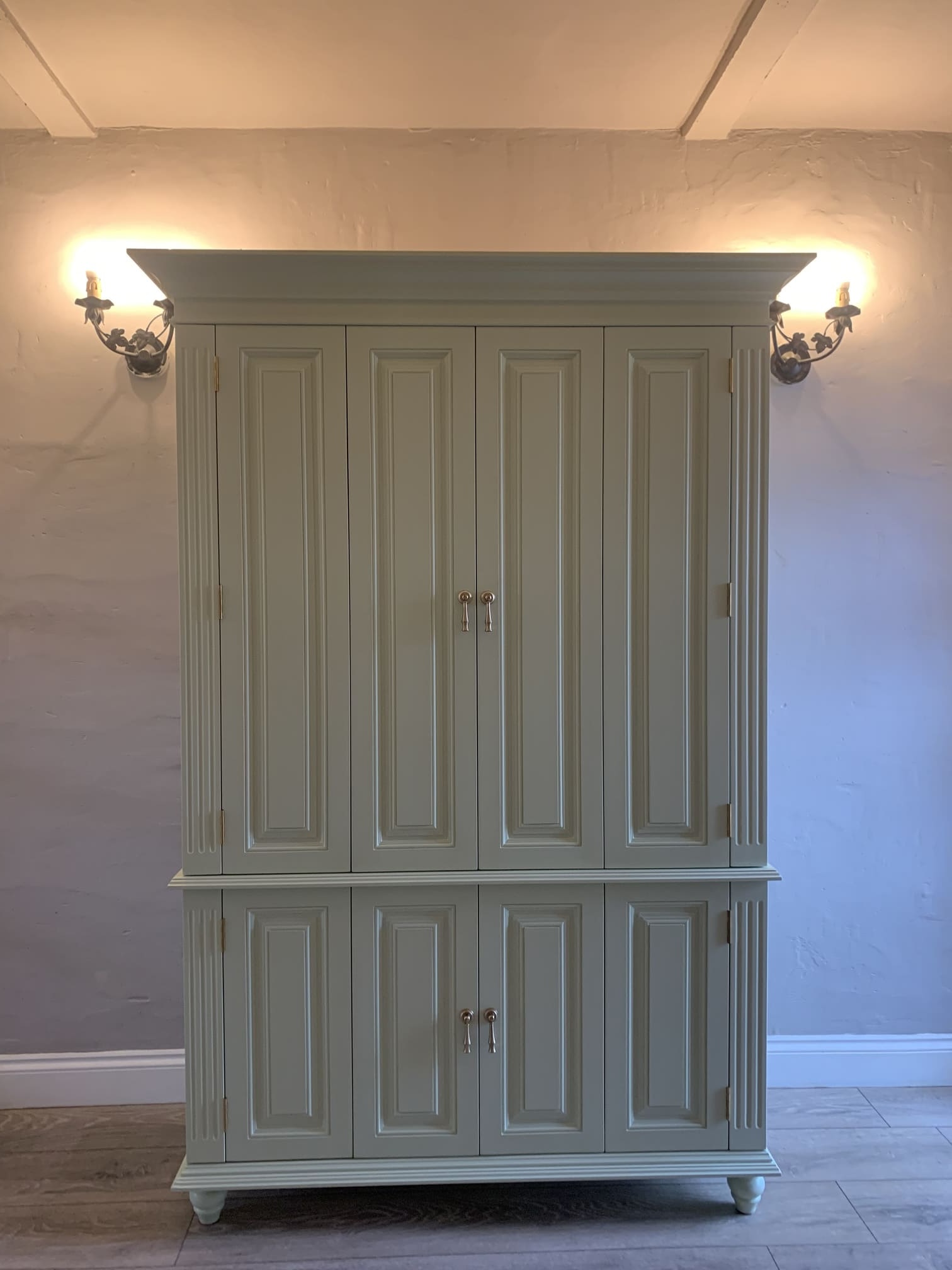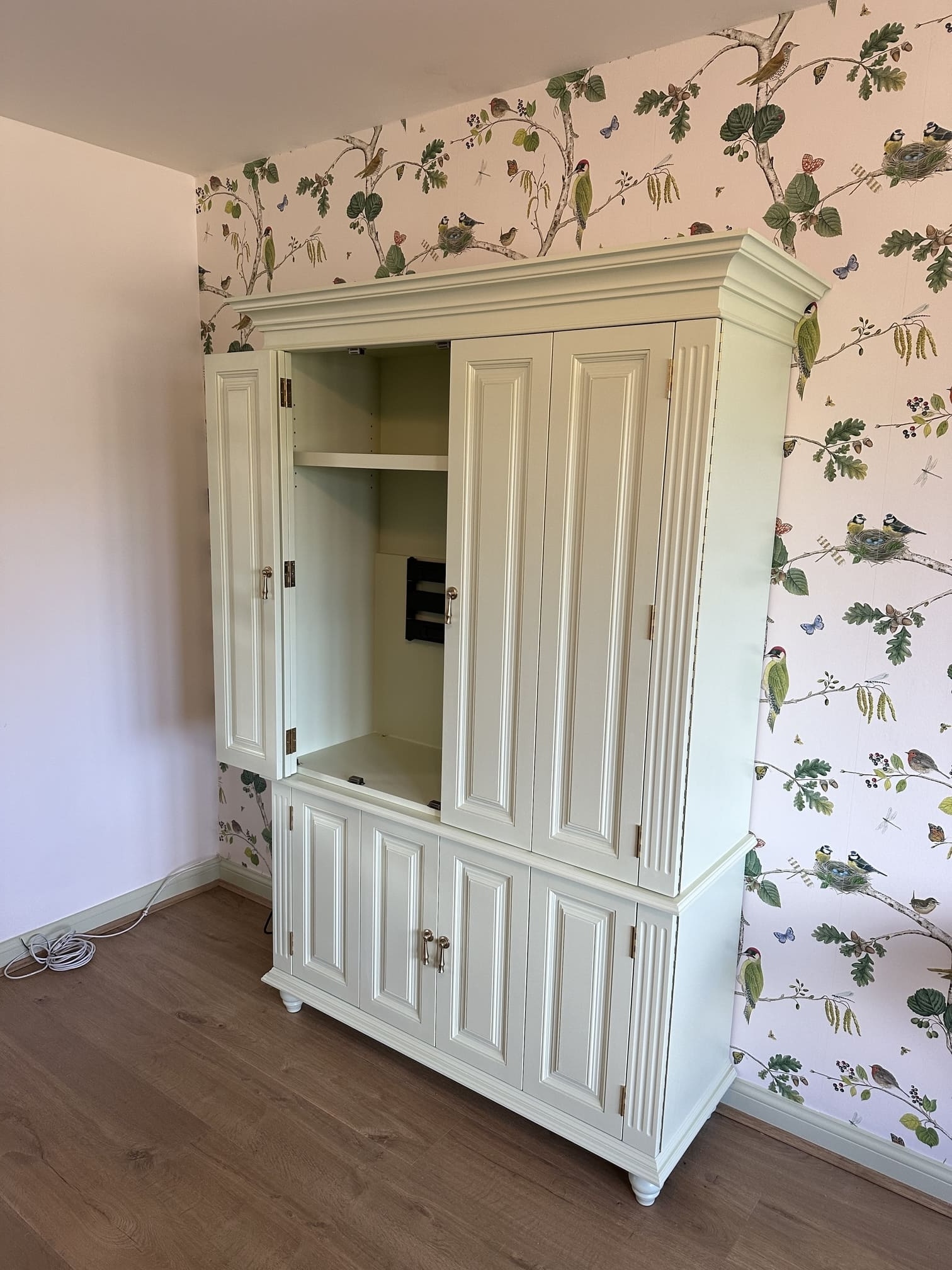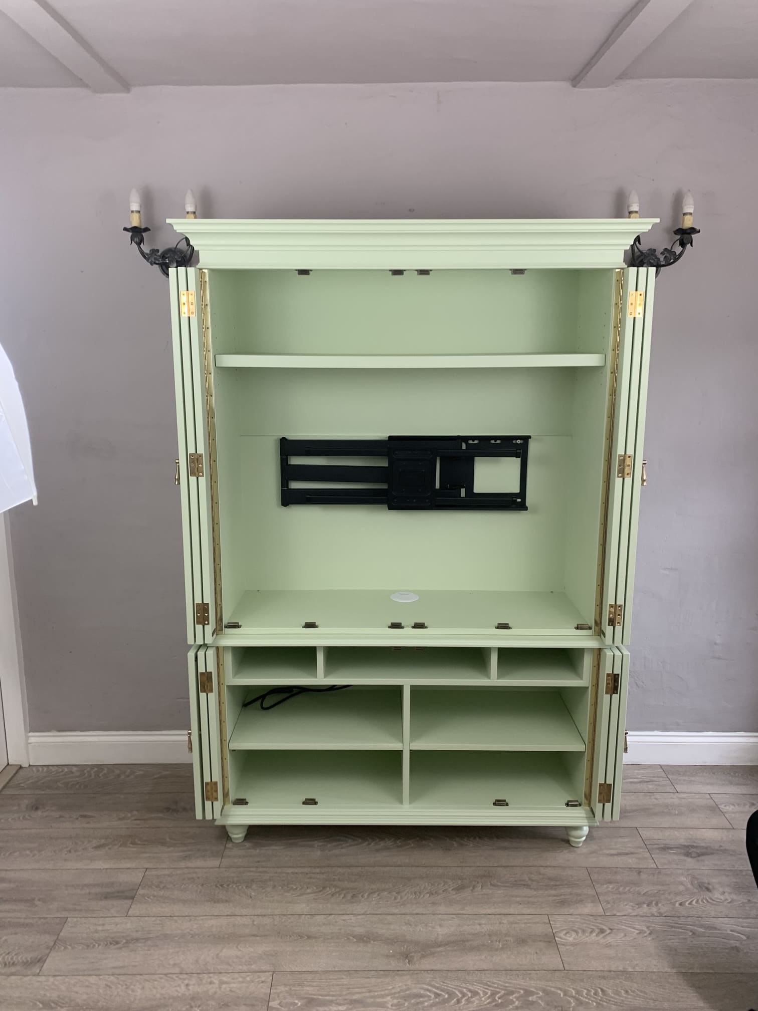 Bespoke TV unit with bifold doors and internal shelving. Also features pull-out TV bracket and raised panel-style doors.