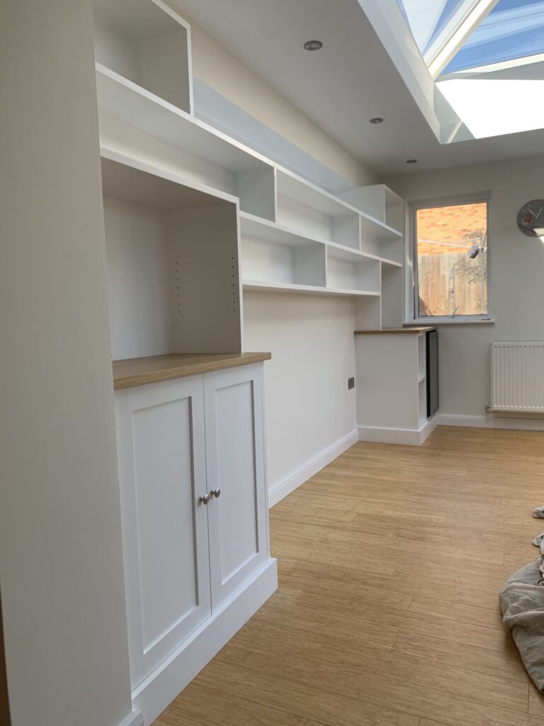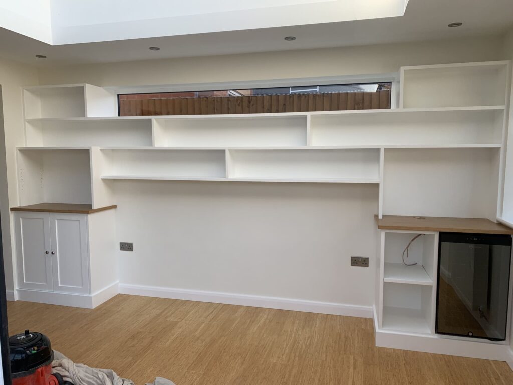 A bespoke bookcase with units and integrated wine fridge, framing a settee and window. Painted in Brilliant White.