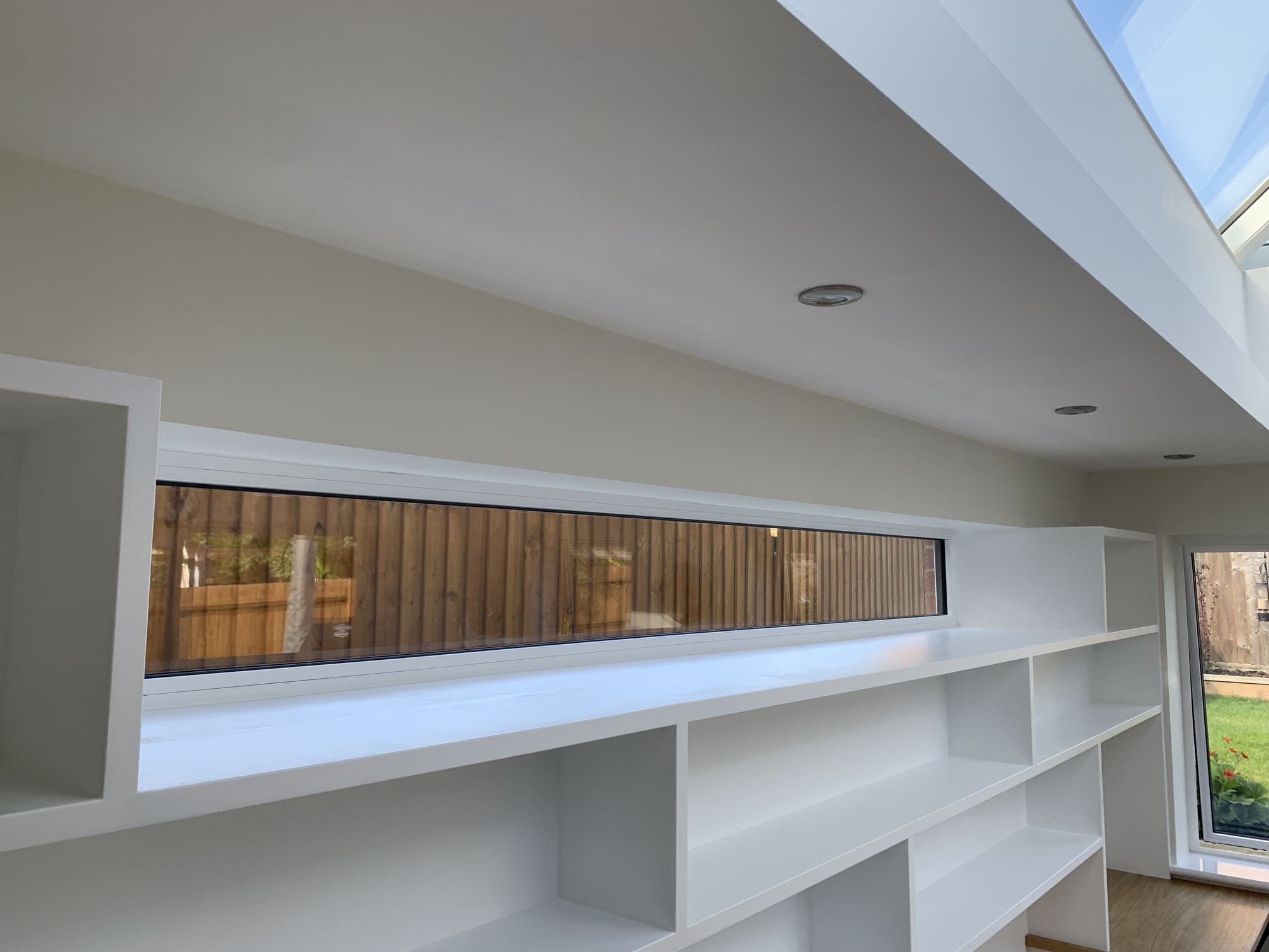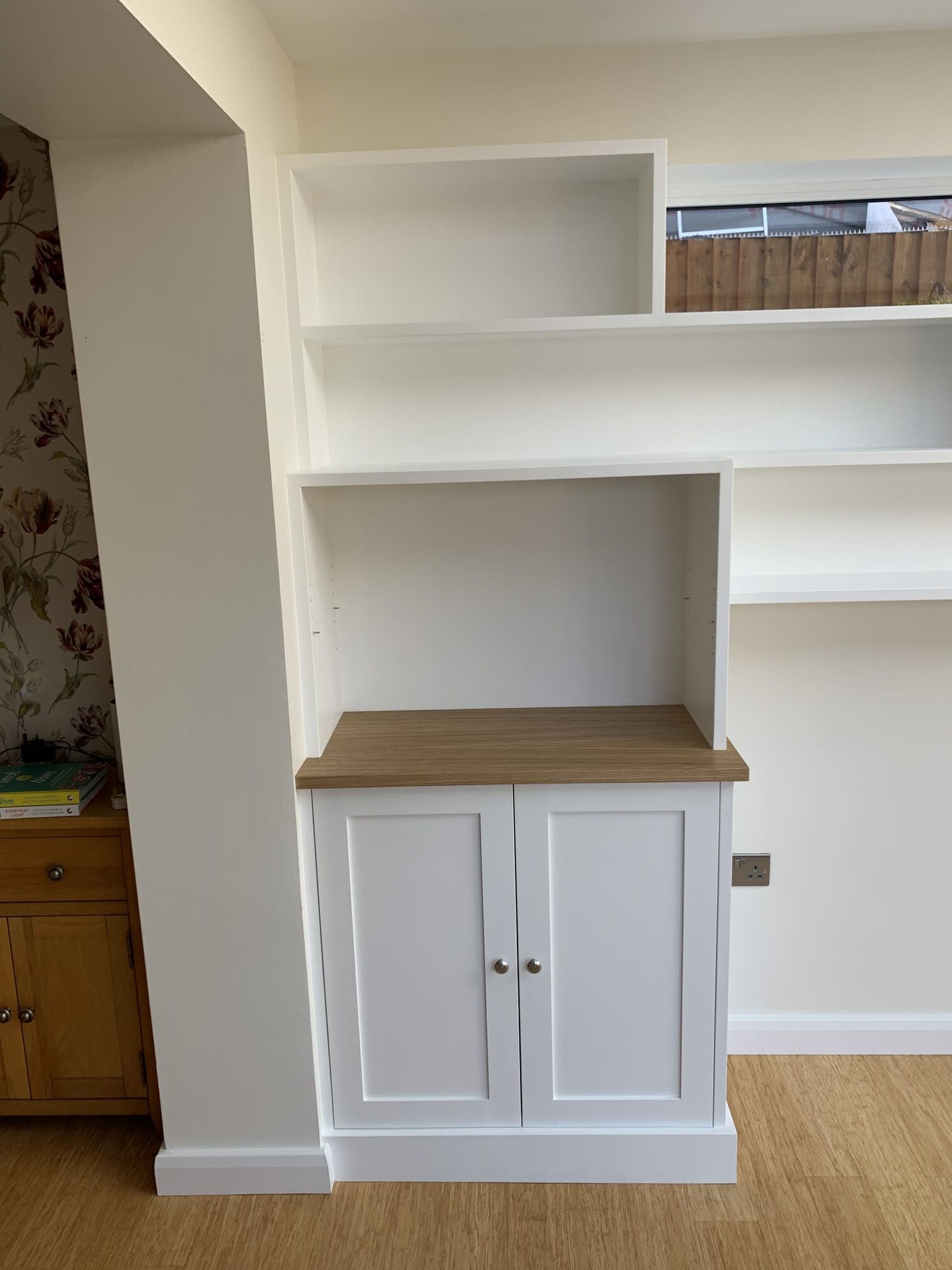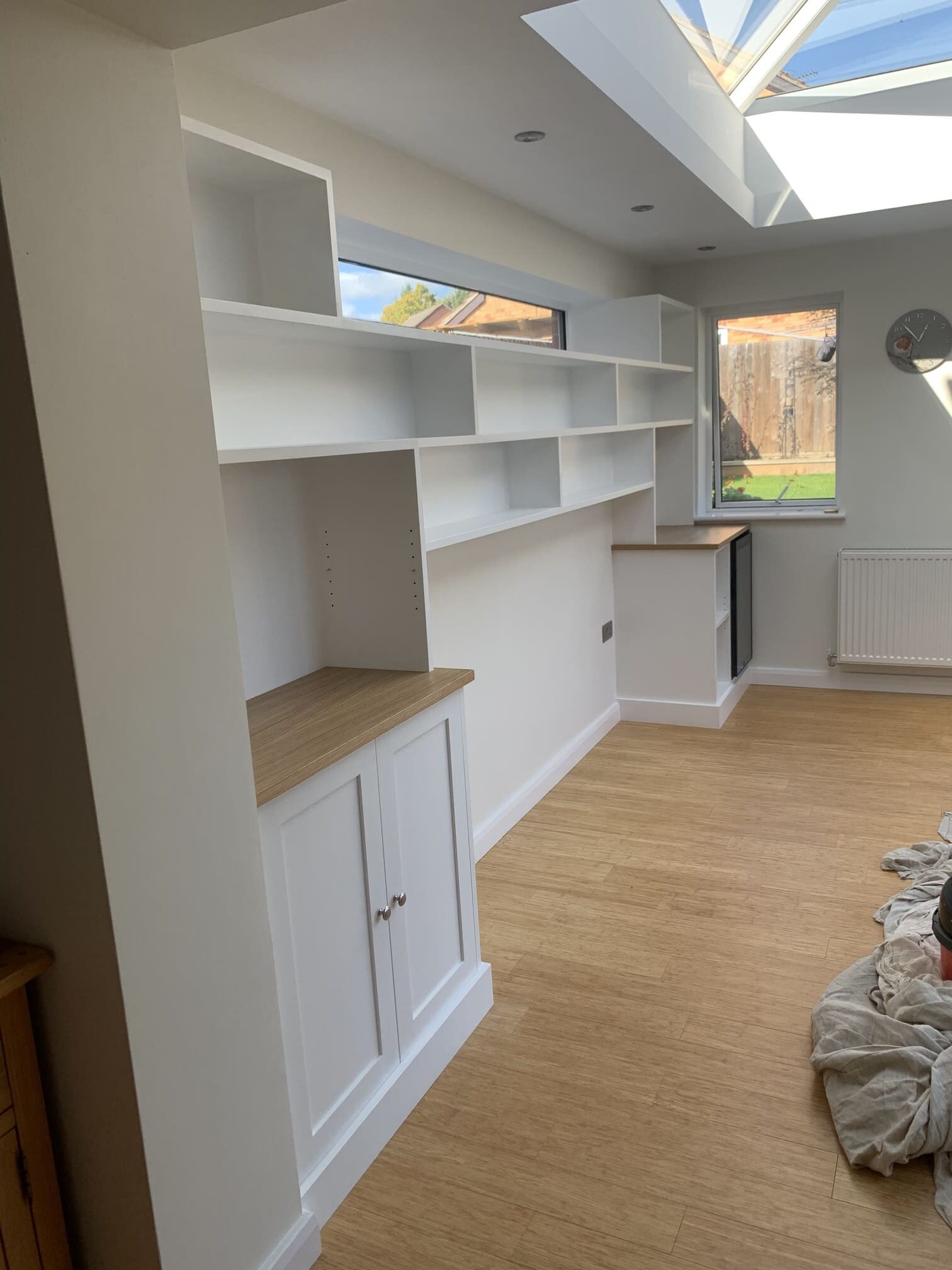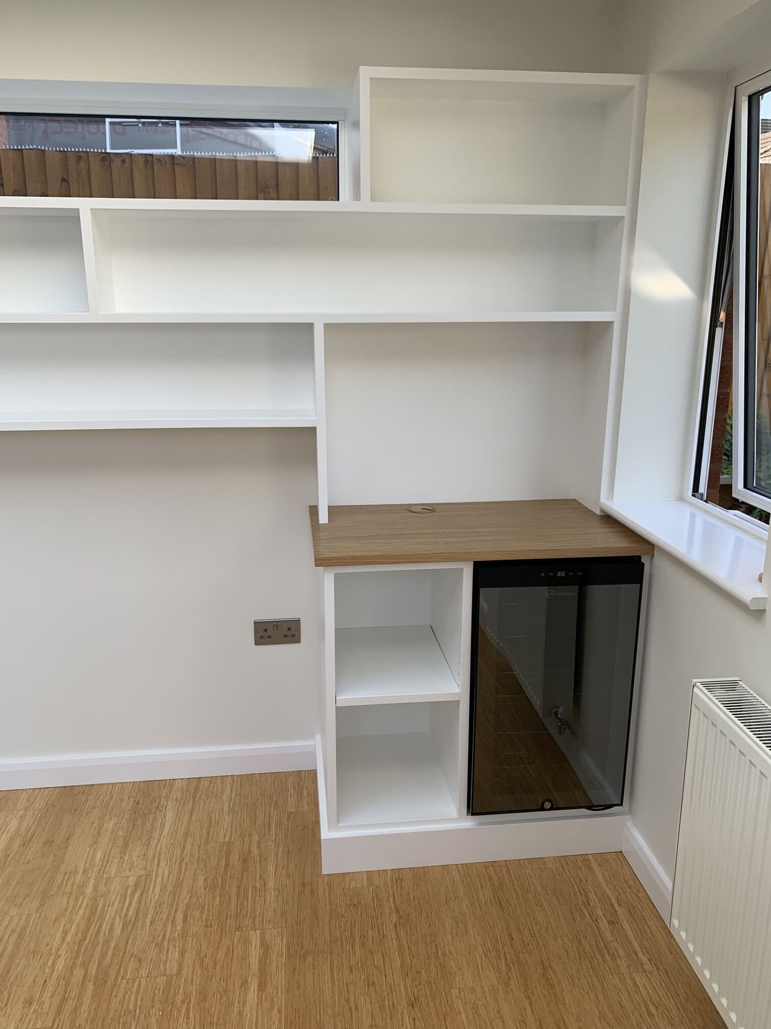 A bespoke bookcase with units and integrated wine fridge, framing a settee and window. Painted in Brilliant White.