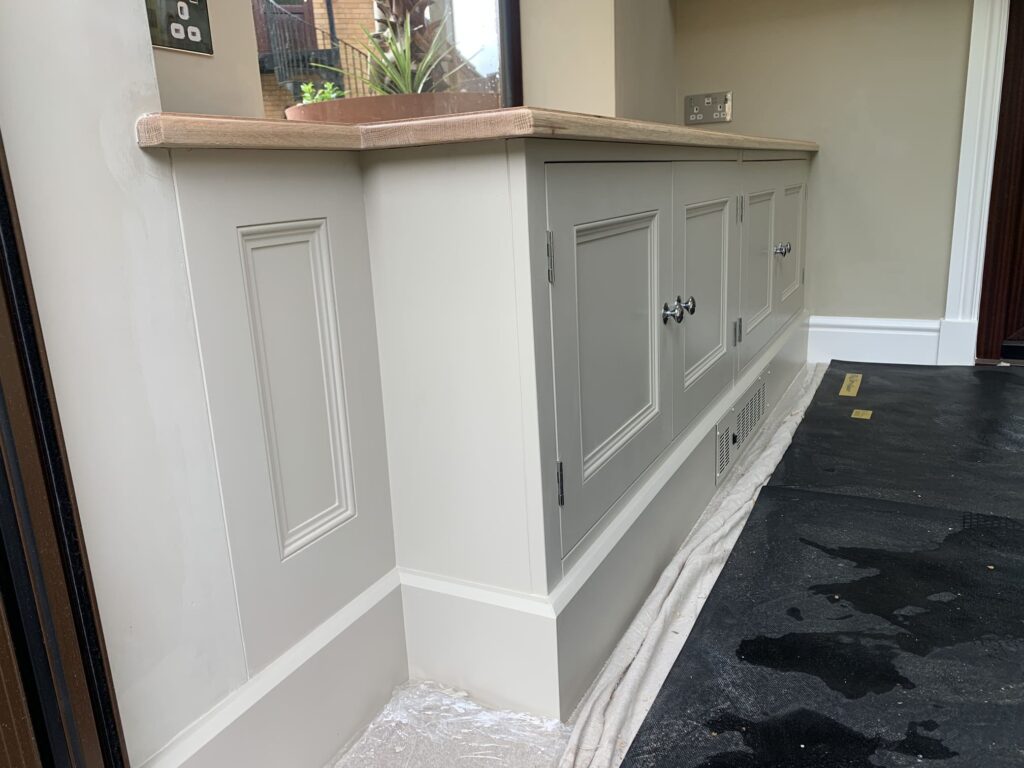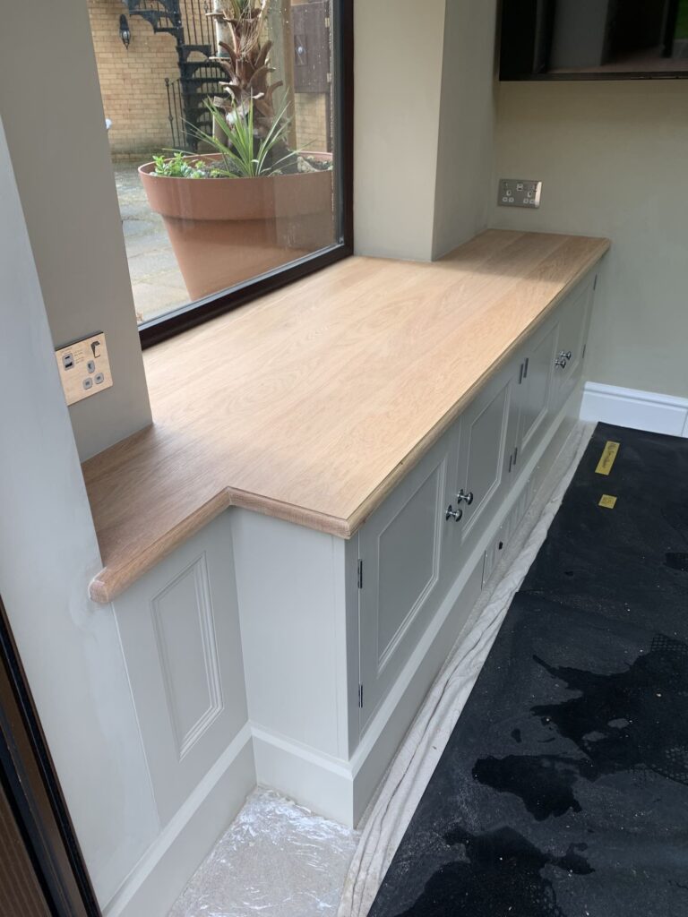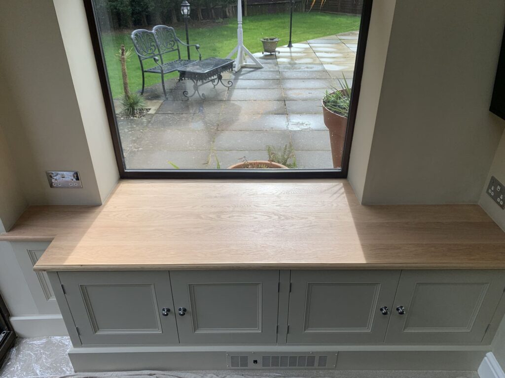 Bespoke window seat with solid oak top. Complete with internal shelving with integrated plinth heater