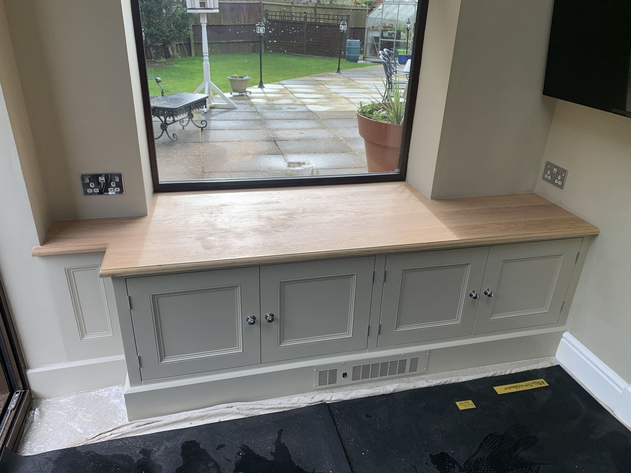 Bespoke window seat with solid oak top. Complete with internal shelving with integrated plinth heater